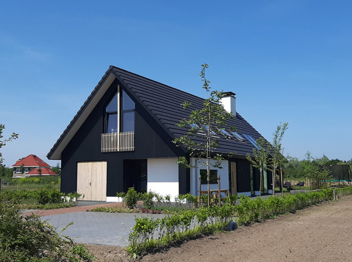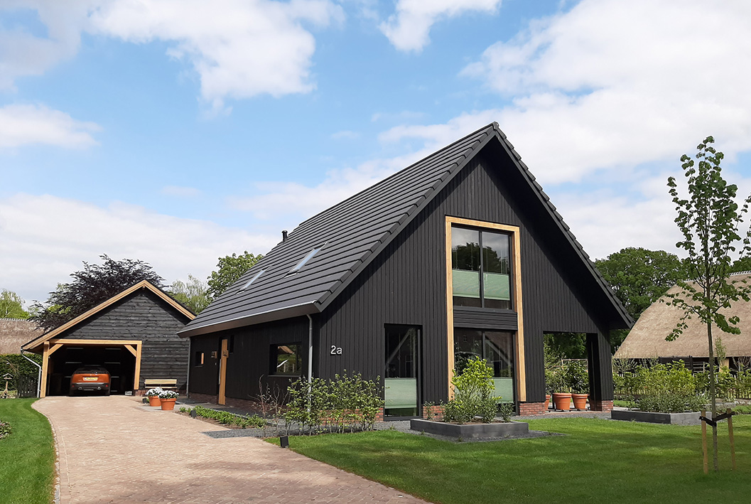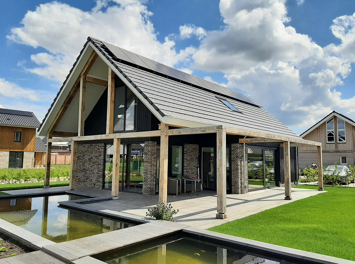 Eiken gebinten, Energiezuinig, Houten gevelbekleding, Houten kozijnen, HSB prefab kapconstructie, Keramische dakpannen, Terrasoverkapping, Triple beglazing, Veranda
